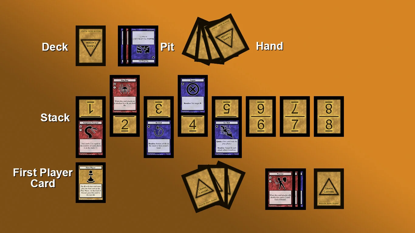 The game is played using a number of different areas. Both players share a Stack in the center of the table. In addition, each player has a: Deck, Pit, and Hand.