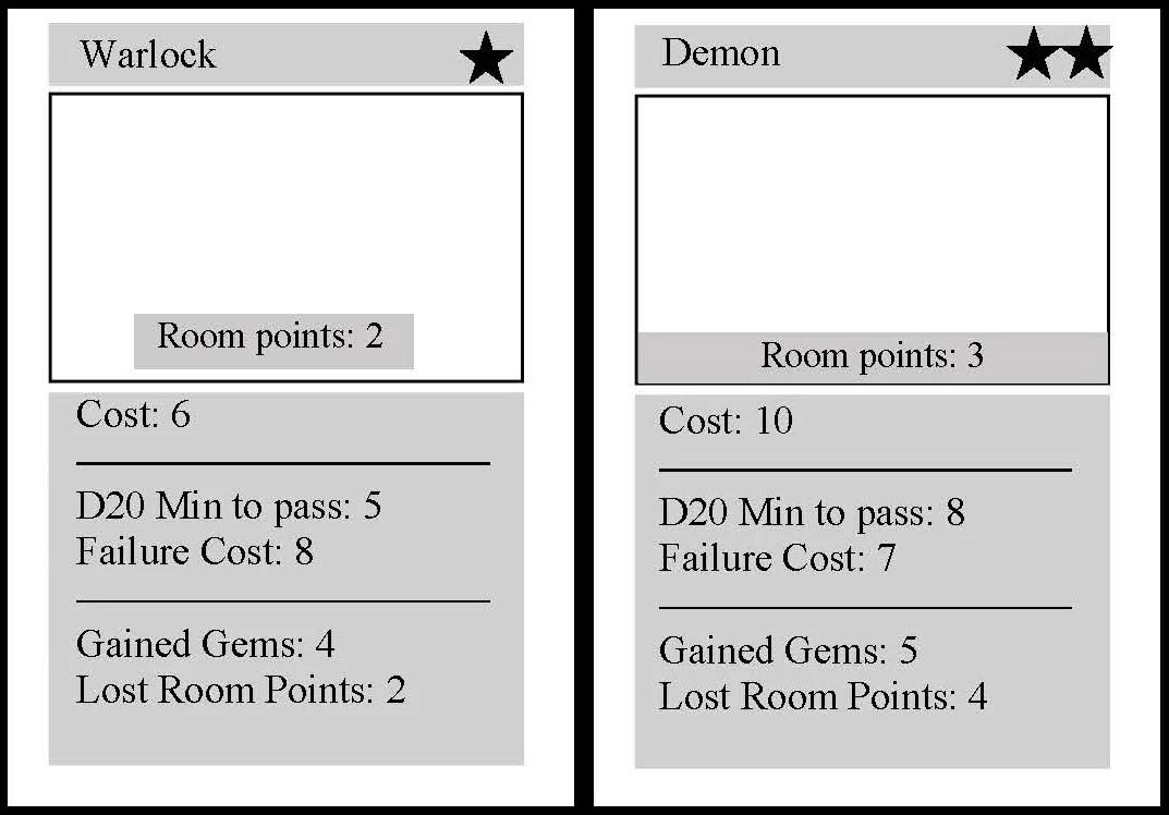 A 3 room point card has a D20 minimum of 7 and a failure cost of 7. Player 1 decides to roll for it. Player 1 rolls a 7 on their dice. Since 7 is equal to the minimum of 7 player 1 succeeds. The counter is at currently 24. Player 1 subtracts the room points of 3 from the counter reducing it to 21. Player 1 proceeds to the next room flipping the top card of the deck. It is now player 2’s turn to roll for the room.